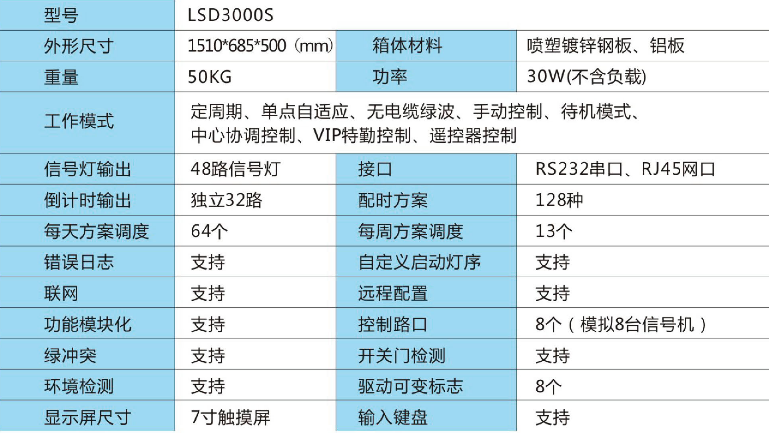 LSD3000S型交通信號控制機采用,穩(wěn)定、可靠的模塊化多處理器、多總線系統(tǒng)結構。采用高速ARM控制器及大規(guī)模集成電路,實時運算道路交通信息,如道路交通狀態(tài)、道路車流量。全部信號機可以組成城城網,完成于指揮中心信息交換。根據(jù)城市交通模型進行云計算,計算數(shù)據(jù)。帶有一塊7寸液晶觸摸顯示屏,和一個數(shù)字鍵盤。